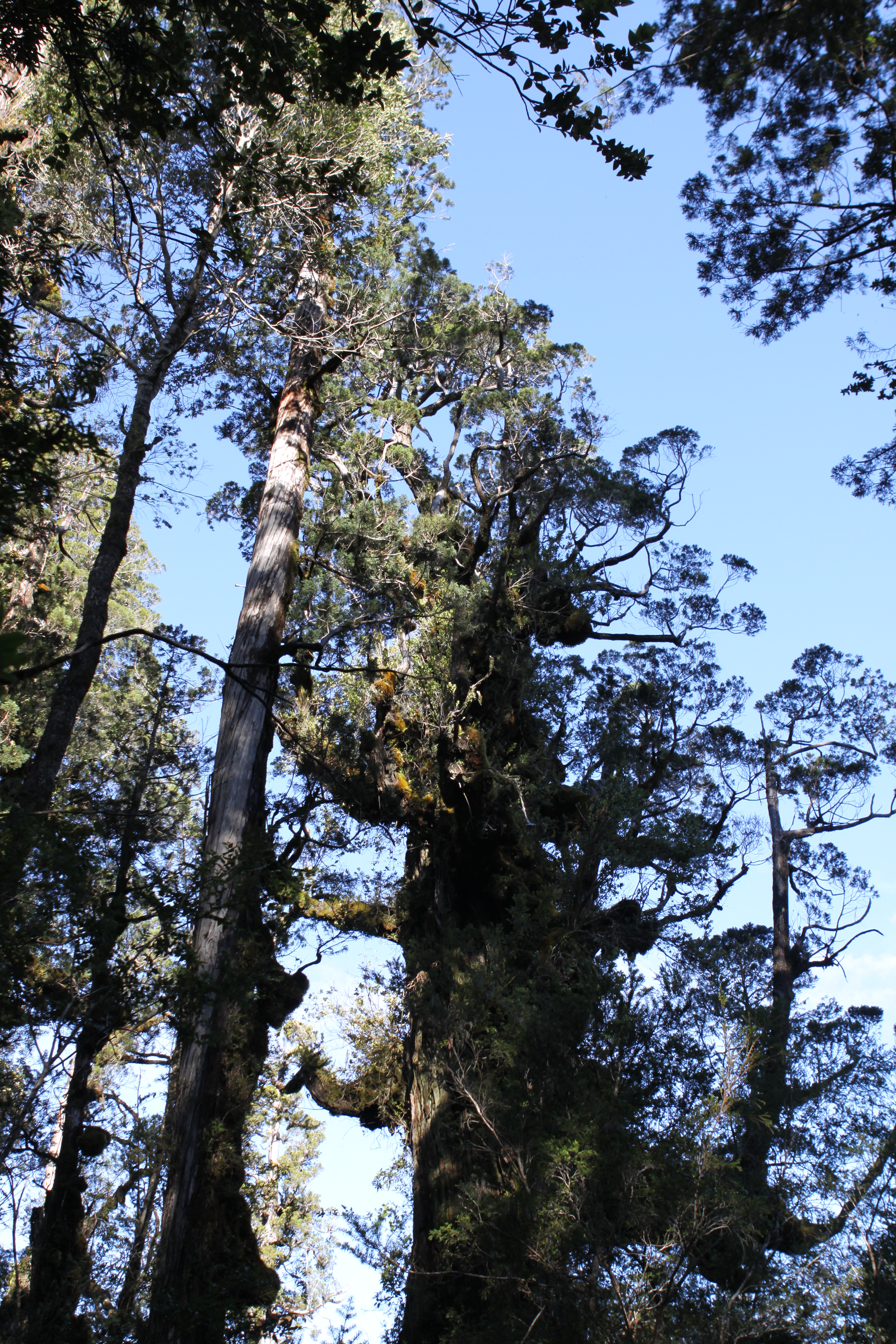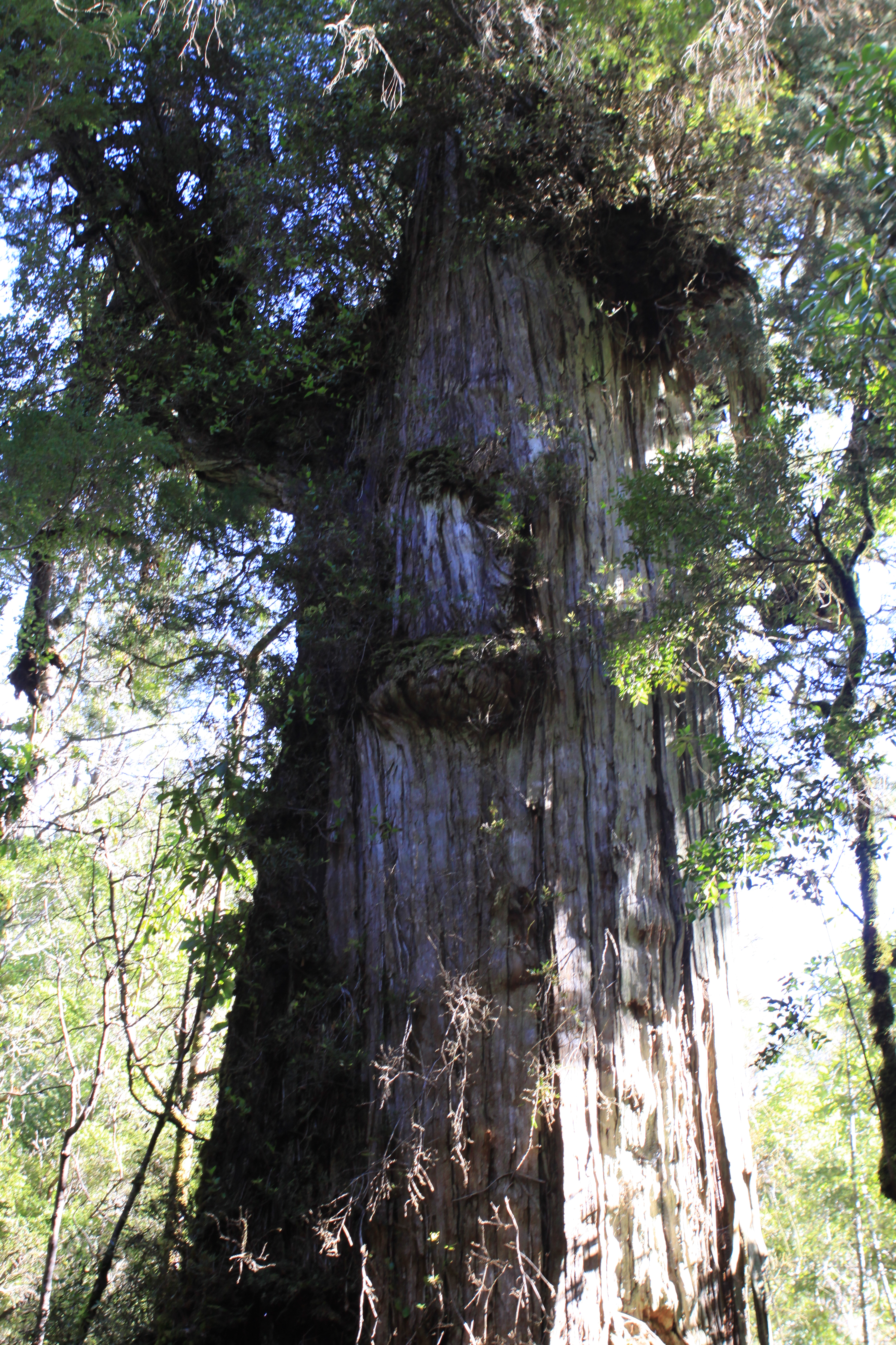 Llegamos al milenario alerce, a uno de los abuelos. Quedamos impresionados al toparnos con su enorme tronco: cuando intentamos abrazarlo y no podemos entre los tres, al dirigir la mirada hacía su copa y verla rozando el cielo, al observar la comunidad de seres vivos que lo acompañan -liquenes, insectos, plantas epífitas que aprovechan su tronco como soporte…-. Después, seguimos por un sendero balizado con tablas de madera, para evitar dañar el suelo, entre un largo laberinto de alerces centenarios, también pequeños bebes que comienzan a nacer. Nos preguntamos cómo será el mundo cuando estos envejezcan como sus compañeros dentro de cientos de años, después de que nosotros ya hayamos dejado la vida, un mundo que nosotros ya no veremos. También nos cuestionamos porque no es frecuente la conservación de bosques donde convivan árboles en crecimiento y árboles envejeciendo. Su vida, como la nuestra contiene los años de plena actividad y vigor, también el largo proceso de envejecimiento hasta morir. Las políticas de gestión forestal actual olvidan respetar la etapa de la vida en que los árboles caminan hacia su muerte; olvidan que los viejos árboles, como las ancianas personas, aportan experiencia a la comunidad y sobre todo serenidad en la etapa de alocado crecimiento de los jóvenes.