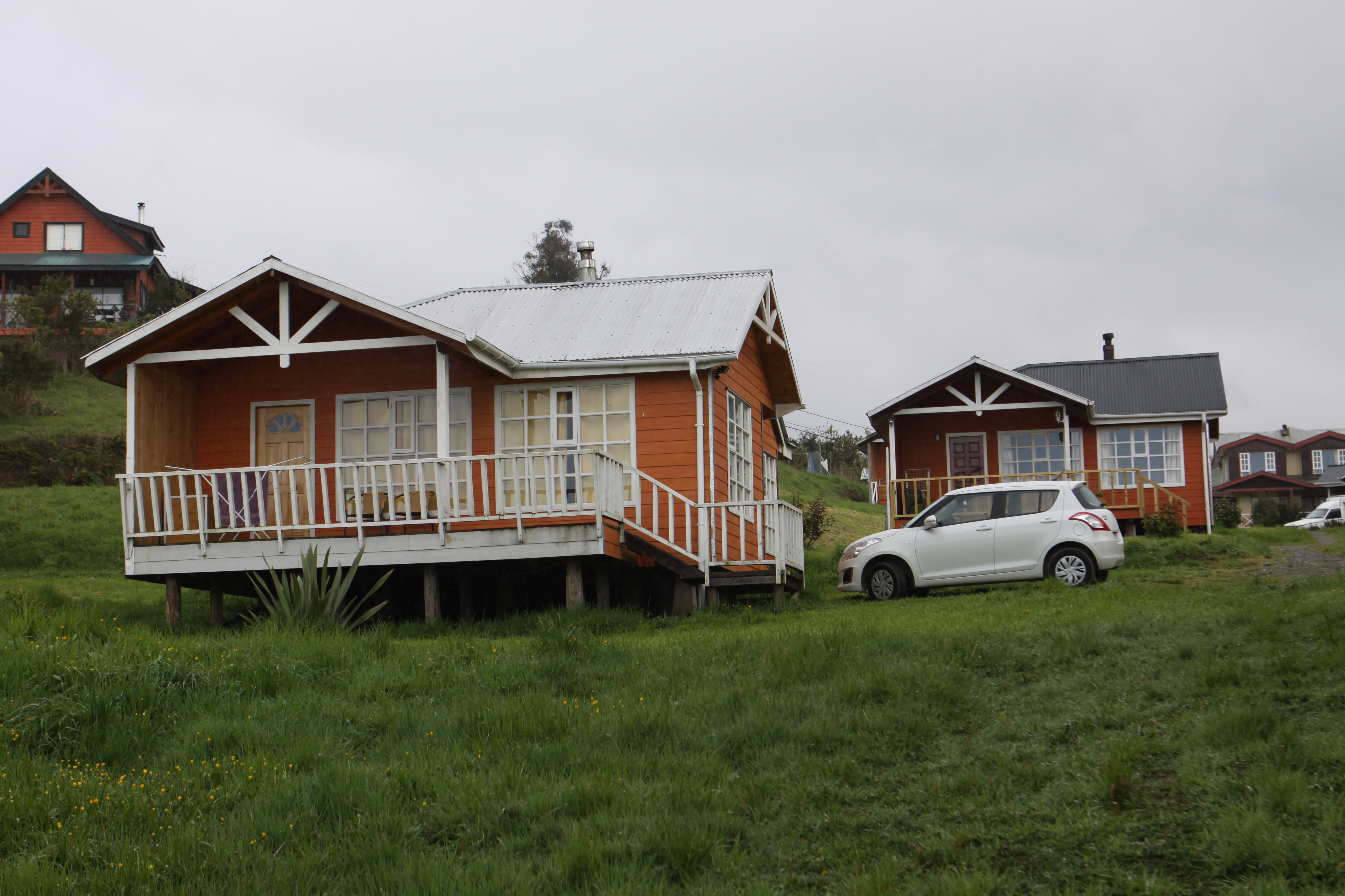 La isla grande de Chiloé nos recuerda al paisaje gallego español. Una semejanza que después seguiremos identificando con el carácter de sus habitantes: reservados, superticiosos, cariñosos… . Una carretera, la ruta 5 panamericana, atraviesa la isla de Norte a Sur. Vemos desvíos interesantes a Iglesias, a espacios naturales como el sendero de Darwin…. Pero nuestro destino es Castro, a escasos kilómetros se encuentra el municipio de Nercón donde se localiza el camping donde hemos reservado una cabaña de madera con vistas a una ensenada donde las mareas oscilan y dejan el océano o las playas descubiertas. Se trata de las Cabañas Piedra Blanca. Lo gestiona un profesor de matemáticas jubilado. Tras cesar en su trabajo que desarrolló en la Patagonia, decidió ubicarse en esta zona tan tranquila y con el encanto de la costa; para amortizar su inversión y garantizarse unos ingresos a su pensión, imagino que decidió aprovechar su terreno con este negocio, en el que además tiene la oportunidad de relacionarse, y en el que los clientes nómadas encontramos durante unos días nuestro hogar. Es muy amable, incluso nos deja su casa para que Alicia y Mar utilicen la wifi para enviar unos trabajos que deben entregar estos días en la Universidad. Todos los días disponemos de madera seca en la puerta de la cabaña, tan nececesaria para enceder la estufa que nos caldea el ambiente cuando al llegar la noche y empieza a refrescar.