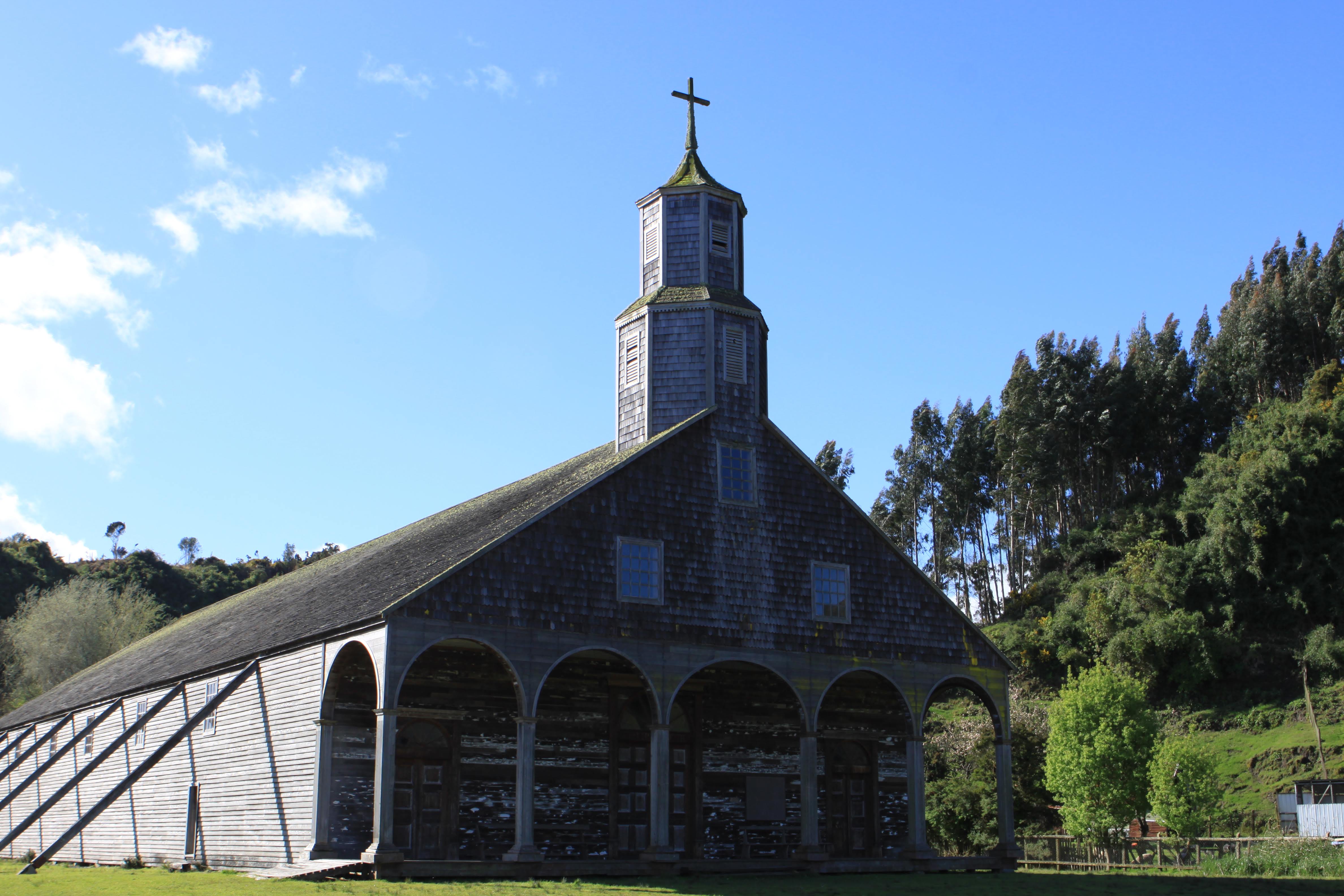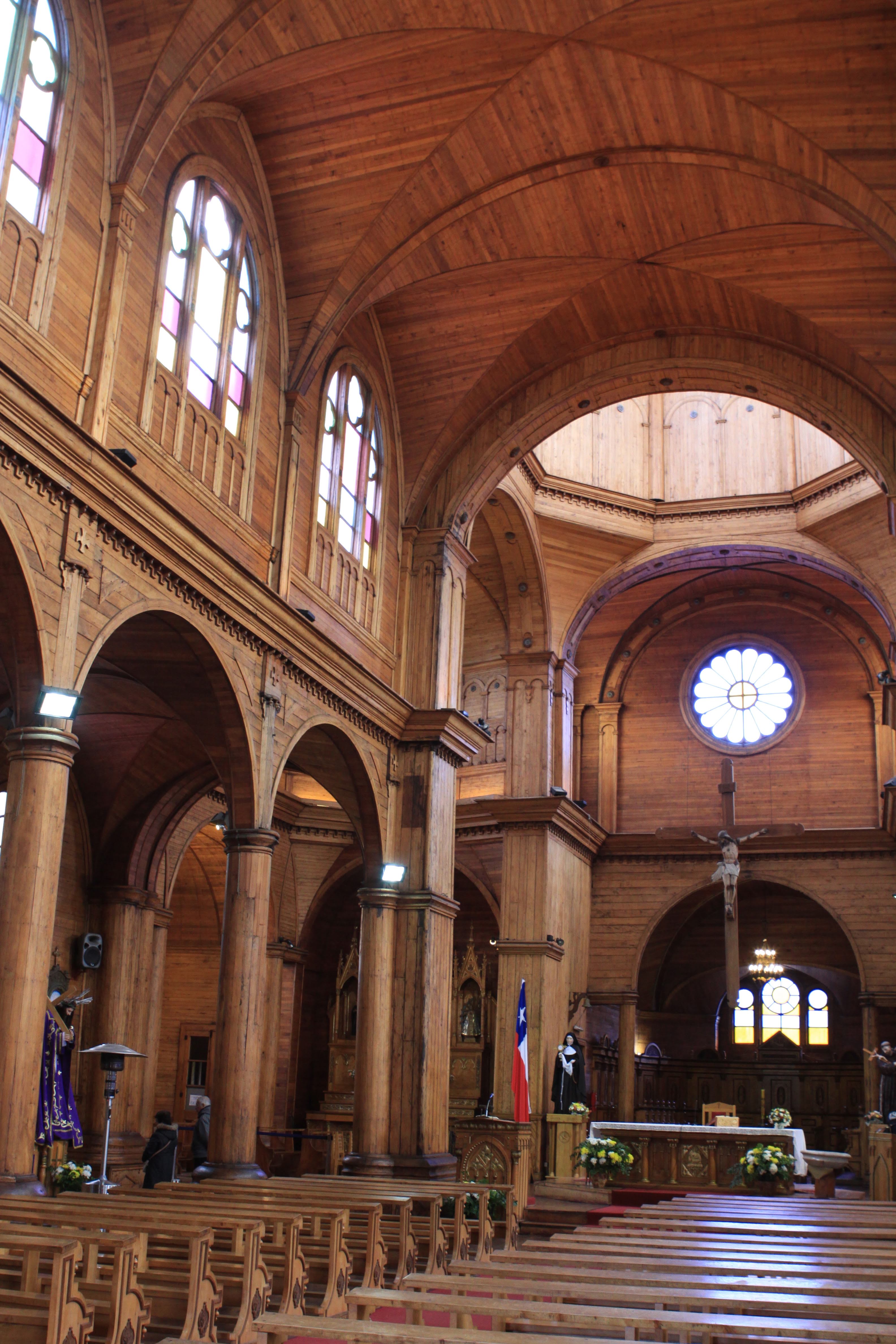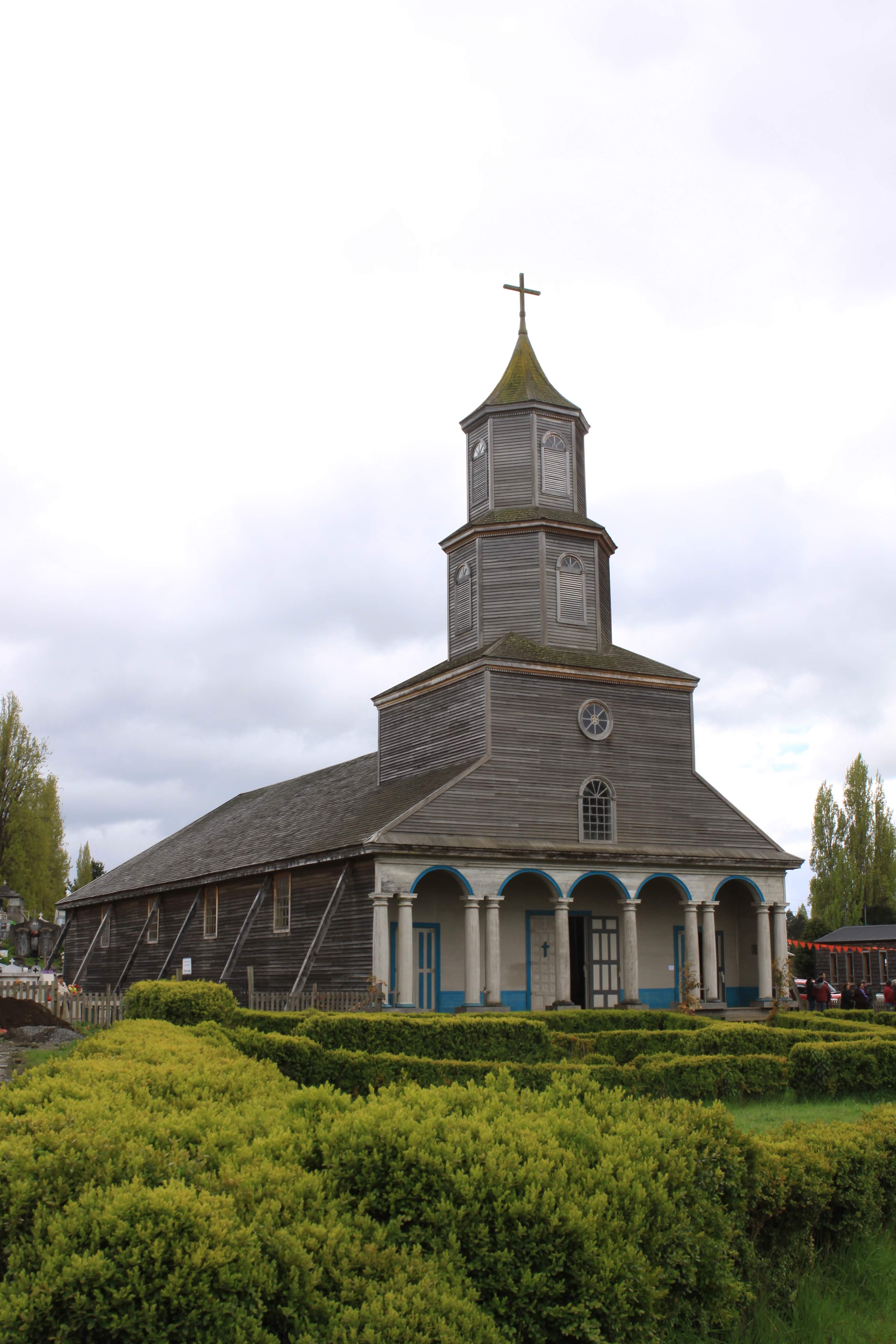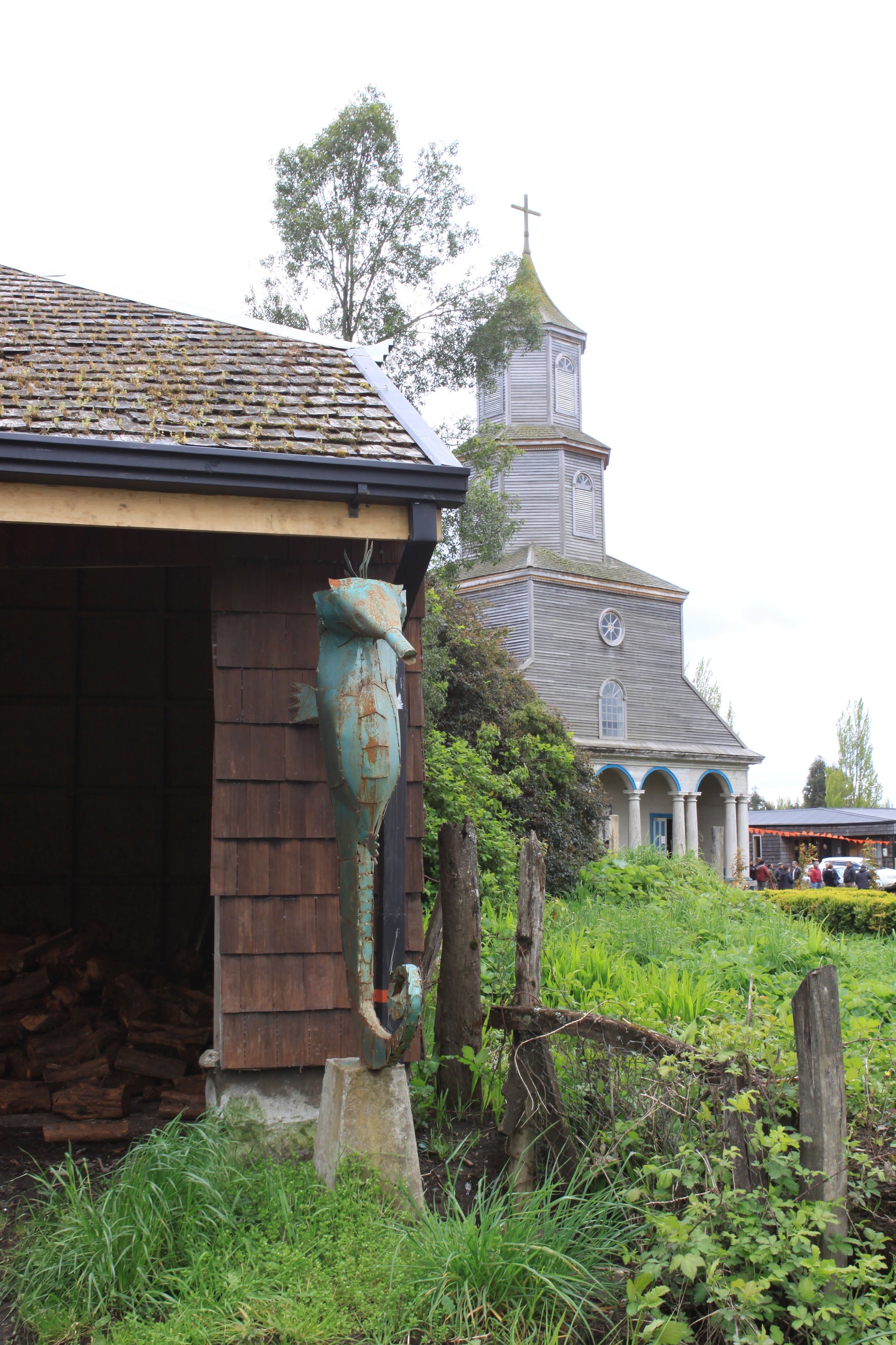 En Quinchao la gran Iglesia absorbe toda nuestra atención. Dentro leemos los paneles que nos explican el proceso de su su restauración, también restos de madera de alerce procedente de su techo original. Se está celebrando una eucarística. El culto es más participativo que en las iglesias de Europa, y en la celebración se conserva el folclore popular.