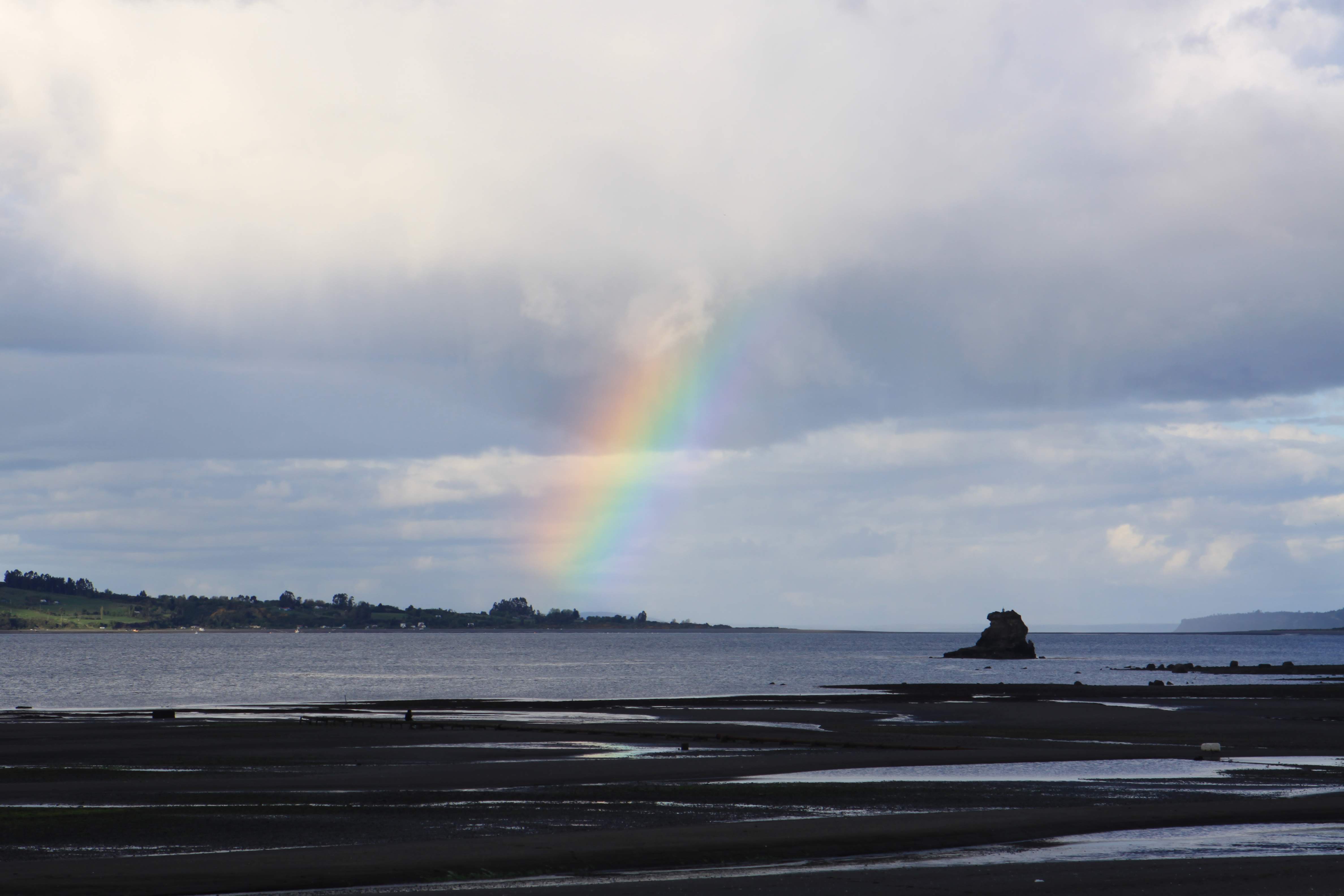 Por último antes de regresar visitamos Achao. Destaca aquí también su Iglesia de Santa María de Loreto. Junto a ella en una cafetería, que parece recién inaugurada, tomamos un café y tarta. Sus dueños, muy amables, nos indican que pidamos la llave al cura y visitemos la iglesia por dentro. Ya se está poniendo el sol y decidimos continuar. Nos acercamos al muelle y nos despide un enorme arcoíris con su gran arco que une la isla con su vecina.