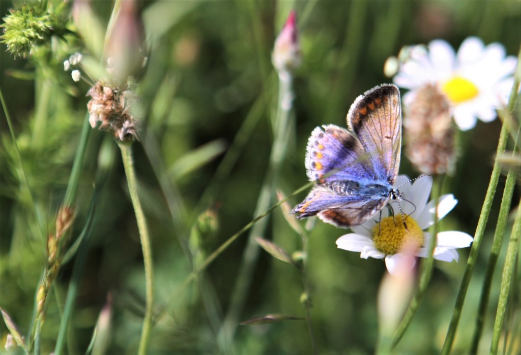 Ya en fase II del desconfinamiento por el COVID 19, hemos podido retornar a nuestros muestreos de campo en el monte de Castelfrio. Una primavera generosa en lluvias ha dejado a las puertas del verano un monte muy florido con abundante hierba cuyas espigas se elevan más de medio metro del suelo. Una de las mariposas más abundante que hemos observado volar es la Polyommatus icarus. Sus dos punto negros en la base del reverso de las alas anteriores la delatan y facilitan su identificación para un aficionado, sin querer entrar en detalles más complejos como la comparación de escamas androconiales. No obstante hemos de tener en cuenta la enorme variabilidad de esta especie.