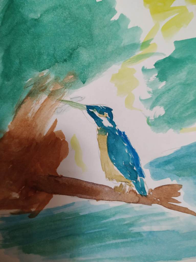 Sospechaba de su presencia y tras un tiempo escondido tras una sarga, que me permitía observar gran parte del cauce, una sombra se ha zambullido en el agua. Al salir se ha posado en una rama de chopo suspendida sobre las aguas . Era él, con un pequeño pez atrapado con su pico que daba coletazos para escapar, pero que tras unos minutos las fuerzas le han abandonado, momento en que el pájaro ha aprovechado para tragarlo. Han sido unos minutos para observar en vivo esa imagen soñada.