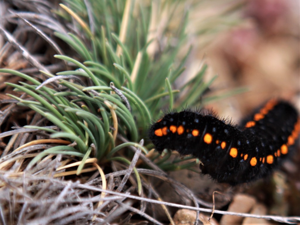 Aficionados a los insectos, sobre todo de mariposas capaces de sobrevivir en estas tierras ásperas y hostiles. La Erebia epistygne, un día frío como es hoy, con temperaturas que apenas superan los 5 grados centígrados, no se ha resistido a la necesidad de volar sobre los tomillos y las gramíneas para completar su ciclo biológico. La Parnassius apollo en su fase de oruga pasta entre las matas de sedum soportando el desapacible clima de estos primeros días de Mayo.