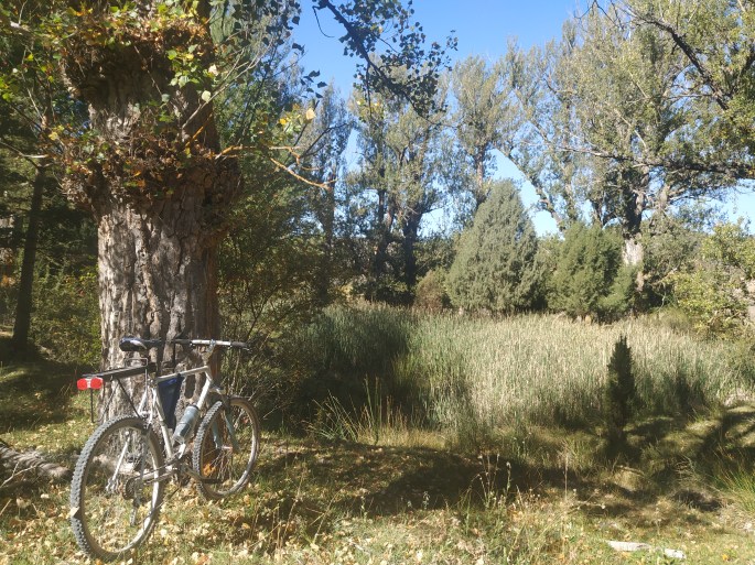 ¡Se puede hacer! Es un recorrido donde no se mide el tiempo, si no encontrar la satisfacción de pedalear mientras observamos unos paisajes excepcionales. Atravesamos un entorno asilvestrado, en el que el ocasiones y sin mucha dificultad llegaremos a cruzarnos con cabras monteses o escucharemos estremecidos el fuerte ladrido de la voz del corzo. Pero sobre todo el silencio, sólo roto por el susurro del viento azotando los árboles y el que se produce al chocar con nuestro cuerpo conforme avanzamos sobre las ruedas. En las partes altas, en ocasiones a escasa altura nos sobrevuelan buitres, que podemos observar con nitidez pues su altura de vuelo apenas nos separa unos metros, distancia en la que somos capaces de oir el sibilino roce del aire al rozar sus plumas. Estos últimos días de la ola de calor que ha traído el veranillo de San Miguel -curiosamente en esta fecha es cuando se renovaban los contratos de arrendamiento de las masadas-, nos ofrece los últimos vuelos antes del invierno de algunas mariposas como las Colias croceus, Lassiomata megera o Póntia daplidice, que se nos cruzan en el camino en sus transectos de flor en flor libando el último néctar antes del invierno.