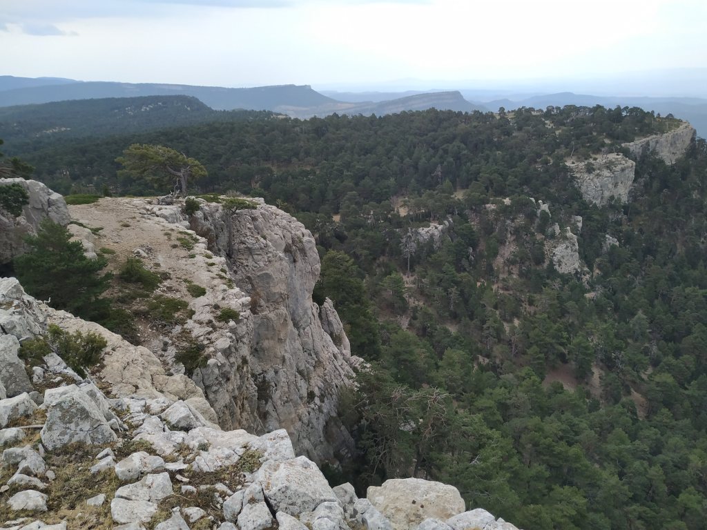 Bajo los pinares ocupando la base del cinglo en sustratos compuestos de materiales generados por la rotura de las rocas calizas, el pinar silvestre y negral es espeso. Más abajo en suelos profundos de arcillas y arenas se desarrollan bosques caducifolios de encina y quejigo, junto a sabinares albares. Ese medio con buen suelo, históricamente lo han aprovechado las poblaciones humanas para abrir áreas de pastizales y cultivo. Es el espacio ocupado por las masadas, hoy en ruinas y en proceso de abandono. Y si seguimos descendiendo en altitud, encontramos, en ocasiones un caos de grandes bloques de areniscas deslizándose sobre las arcillas que los soportan, con curiosas e impresionantes «chimeneas de hadas» cuando una placa de material resistente protege a la deleznable arcilla. En ese sustrato silíceo se extienden extensos pinares de «Pinus pinaster«. Los pinos que antaño quedaron cobijados en cerros, han proporcionando las semillas y generado el reclutamiento de nuevos pies que están colonizando los campos de cultivo y pasto abancalados en superficie ganada en su día a las ladera y a los barrancos, con muros de piedra seca que los protegen de la escorrentía, que hoy el éxodo rural va dejando yermos.