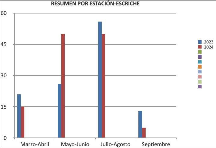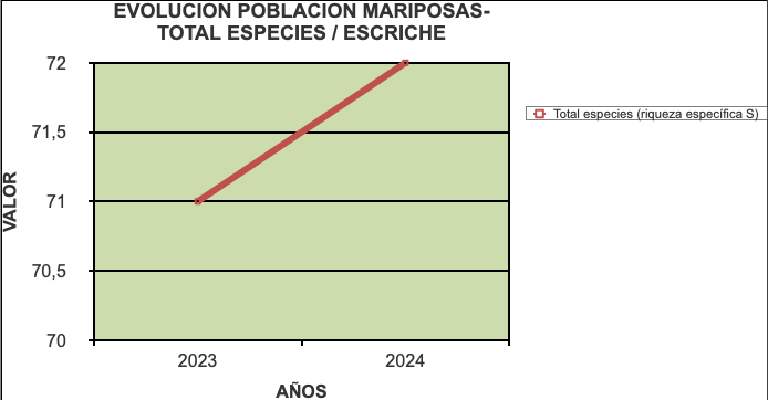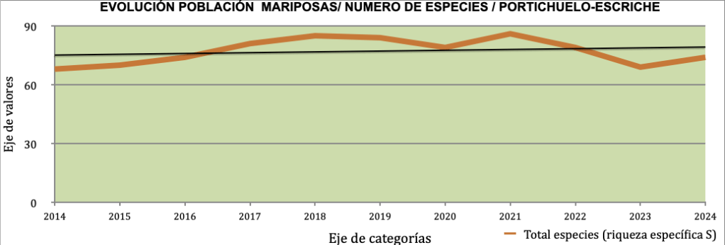 En Escriche se han identificado 72 especies. La climatología adversa de este año en este lugar, creemos dadas sus características físicas ha propiciado un menor agostamiento del pastizal, lo que ha permitido mantener condiciones más favorables en comparación con los datos que hemos obtenido en Castelfrío. Hemos de destacar la detección de una población de Erebia zapateri en en año 2023, aunque este año 2024 no hemos observado la eclosión de imagos. Hemos vuelto a identificar esta temporada la Euphydryas desfontainii, y también la Euphydryas aurinia.