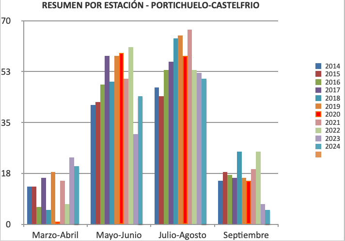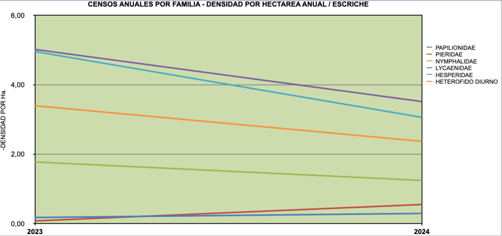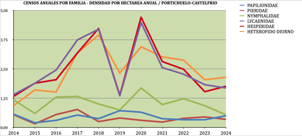 Para corregir los posibles errores de identificación por especie y genero, hemos agrupado y totalizado los datos obtenidos por familias. Observando un descenso considerable de la familia de los Lycaenidae y Hesperidae, que durante los primeros años eran muy abundantes y obteníamos censos de concentraciones en torno al barro y agua. También de algunas especies primaverales como las Anthocharis euphenoides y cardamines.