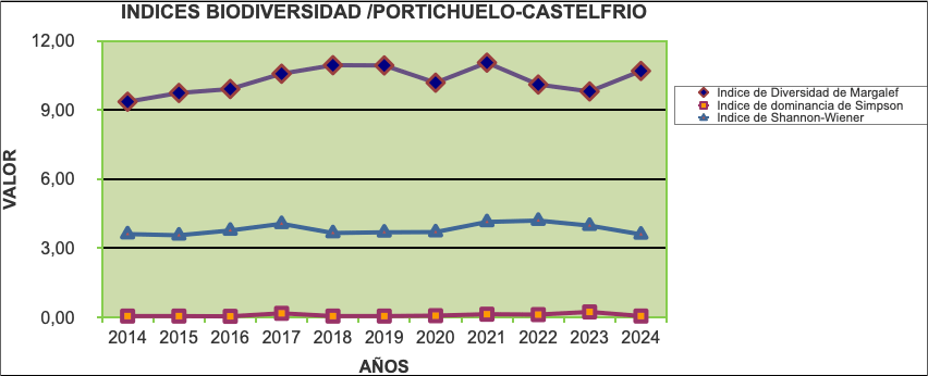 Con respecto a los índices de diversidad de Margalef observamos que se mantienen constante la relación funcional entre el número de especies y el número total de individuos. Con respecto al índice de dominancia de Simpson, la probabilidad de que extrayendo de la comunidad dos individuos al azar, los dos sean de la misma especie, también se mantiene constante. Y en relación al índice de Shannon-Wiener, que expresa la uniformidad de los valores de importancia a través de todas las especies de la muestra, que es una medida del grado promedio de incertidumbre en predecir a que especie pertenecerá un individuo escogido al asar de una colección, también consideramos una evolución homogénea a lo largo de los años. Consideramos pues que se conserva la biodiversidad de lepidópteros a lo largo de estos años.
