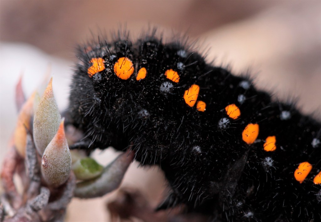 Decenas de orugas negras con dos franjas anaranjadas en sus costados