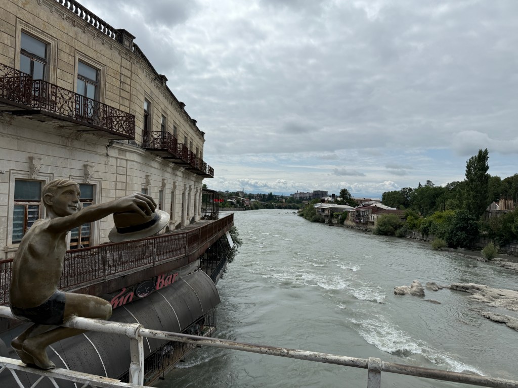 A las 9 se presenta Giorgi, nuestro guía cultural, junto al vehículo que nos transportará junto al conductor. Él nos acompañará hoy para guiarnos en una visita cultural por el centro de la ciudad. A través de los edificios conocemos un poco de la historia de este país. Los personajes de algunas esculturas del parque son aquellos en los que sustenta la identidad de la nación. Georgia a lo largo de su historía ha vivido continuas invasiones que, como la última rusa, primero con los zares y después con el régimen soviético, intentaron borrar su cultura. Los valles de la montaña del Cáucaso, rodeados de altas montañas, siempre han constituido el lugar donde refugiarse. Es allí donde se guarda su tesoro de lenguas y tradiciones.