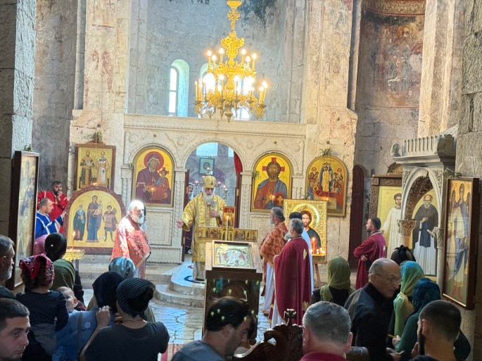 El Monasterio esta muy frecuentado por gente georgiana. Se estaba celebrando la Divina Liturgia, en la que cubriéndonos con un pañuelo las rodillas y las mujeres la cabeza y los brazos, se nos permitía entrar. El guía nos obsequia con unas velas para que hagamos la ofrenda clavándolas en la arena, al pie de un fresco. Esta mañana también nos acercamos a la St. Archangels Basílica, ubicada cerca del hotel, en cuyos alrededores se localizaba un cementerio ortodoxo, notamos cierta seriedad entre la gente que participaba en la Divina Liturgia, y ahora comprendemos que no tuvimos la precaución de cubrirnos el cuerpo. Observamos con curiosidad los trajes de los sacerdotes, con sus largas barbas, y sobre todo el grado de participación en la celebración de los creyentes asistentes.