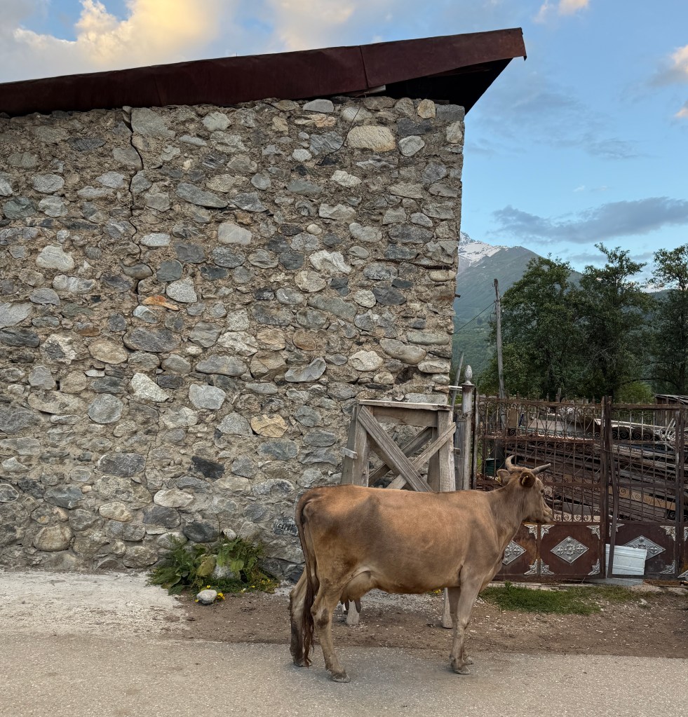Ayer tras un largo viaje llegamos a Mestia. El viaje nos puso en contacto con un país diferente al mundo normativo de donde procedemos. Poco a poco nos fuimos acostumbrando a la tensión de la conducción por una carretera donde continuamente se cruzan vacas, caballos o cerdos, en la que la línea continúa sólo parece indicar el carril, porque son frecuentes los adelantamientos al limite, incluso sin un tercer carril este es habilitado por los tres conductores para no chocar.