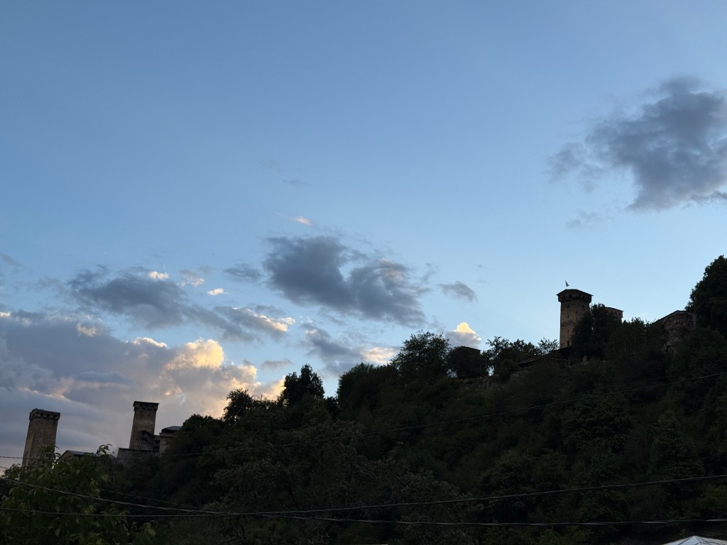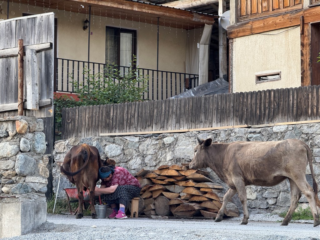 Tras una pequeña siesta visitamos Mestia. Davit nos acompaña hasta una de las torres defensivas, Torres Svan. Nos adentramos ascendiendo a través de una escalera de madera y atravesando un pequeño hueco los diferentes pisos que la forman. También visitamos el interior de una casa tradicional donde convivían en torno al fuego central sus habitantes y los animales. Con la ayuda de los compañeros que dominan el ingles interpretamos los datos que la responsable transmite en georgiano, que a su vez Davit traduce al ingles.