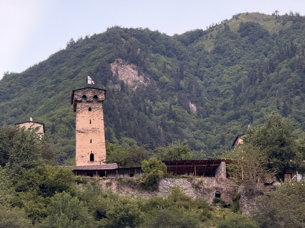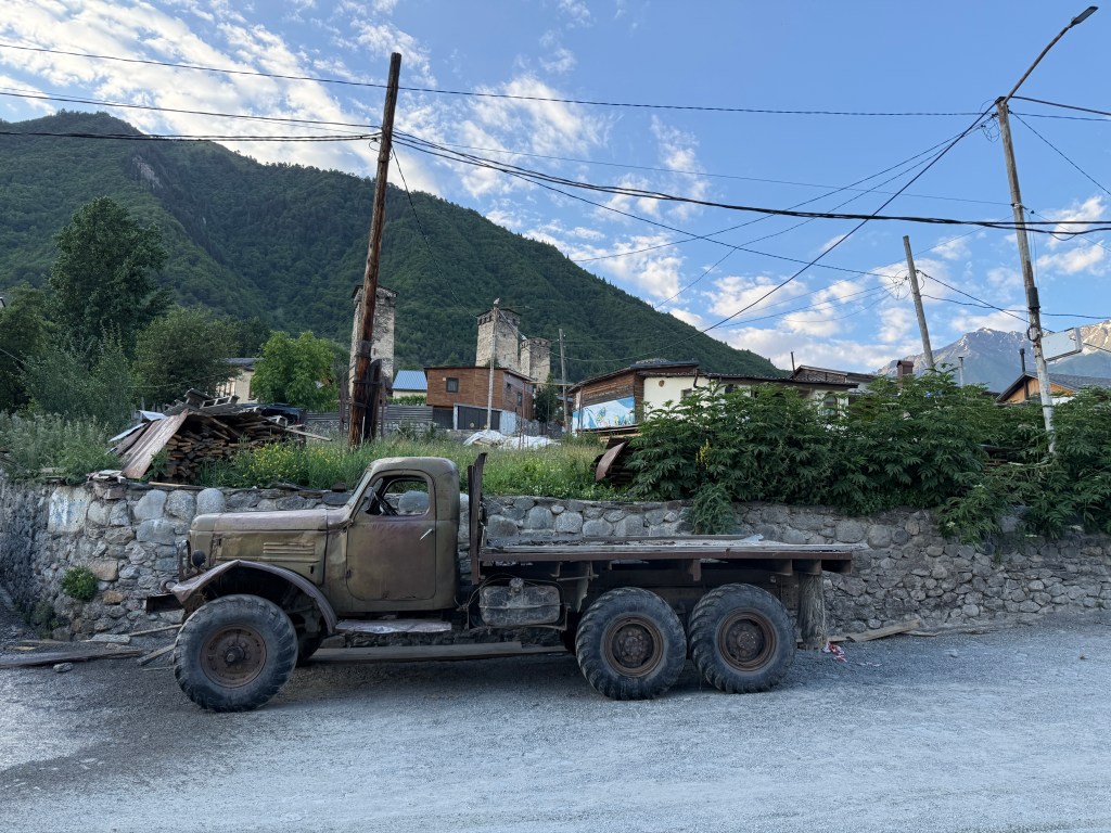 Durante el recorrido de regreso apenas encontramos cultivos. En algún punto divisamos la montaña Ushba y ya en Mestia el pico Tetnuldi (4858 m), colosales montañas que nos acompañaran estos días y que iremos observando desde diferentes lugares. A lo lejos observamos alguna ermita ortodoxa. Al acercarnos a Mestia miramos hacia el pequeño aeropuerto donde aterrizan las avionetas que en invierno traen turistas que llegan al reclamo de las pistas de esquí del Valle, el avance urbanístico de establecimientos hoteleros que crecen conforme avanza el desarrollo de este sector de la economía en torno al ocio del mundo occidental, entre los que nos incluimos. También estructuras ruinosas de cemento en las orillas del río, de las que desconocemos su función. Un urbanismo donde convive la tradición y el impulso modernizador impulsado en los últimos años.