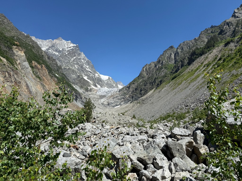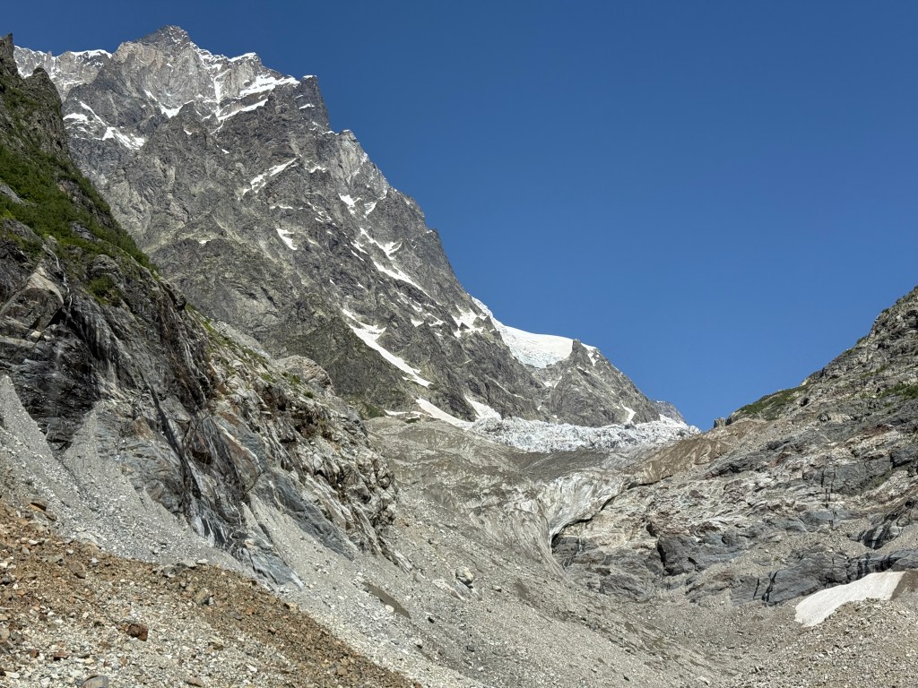 Nos impresionan las aguas bravas del río con su tono lechoso. Un pedrera nos acerca a la morrena en donde quedamos impresionado de la potencia del glaciar, que como en el resto del Planeta esta en regresión -según nuestro guía Davit, son 4 metros en los últimos años-. En el frente de glaciar contrasta los colores blanco y turquesa al fragmentarse el hielo.