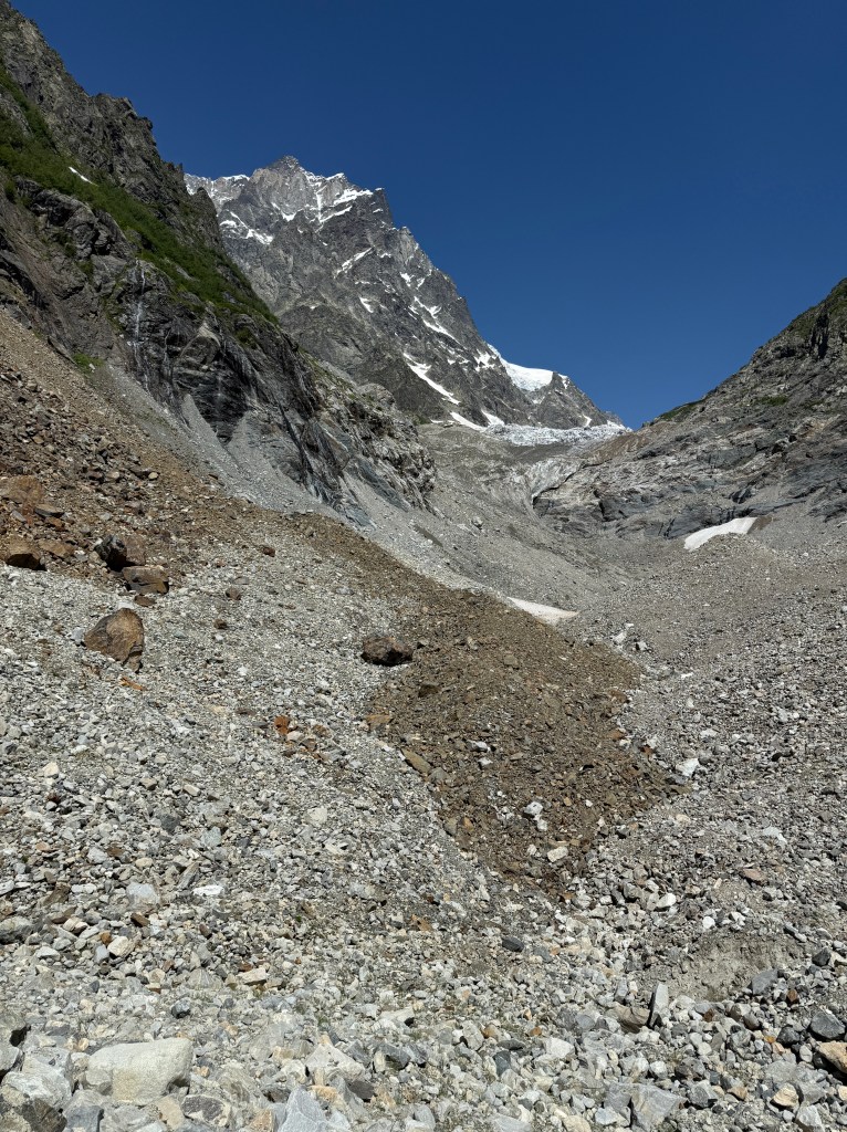 Hemos llegado hasta la morrena frontal, la zona de salida natural de las aguas de fusión, de gran deleznabilidad, por la acumulación suelta sin estructura ni cementación, lo que favorece que sea una estructura efímera desmantelada con rapidez por los procesos erosivos fini o postglaciares. Un lugar donde tomamos la precaución de no acercarnos por que se producen grandes desprendimientos.