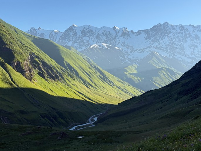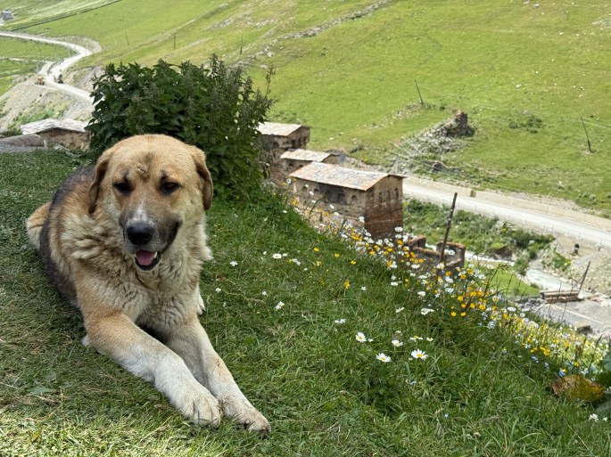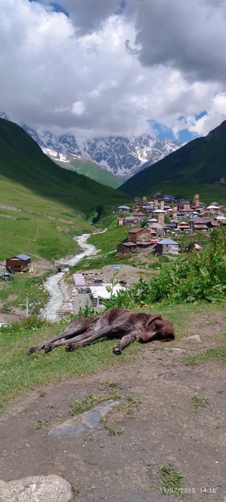 Apenas amanece nos hemos levantado. Un rápido desayuno y partimos desde Ushguli para ascender al monte Llangumbar (2.987 m). En la calle solo nos encontramos los perros que guardan cada casa y que ladran cuando nos ven aparecer por la carretera seguidos del mastín de la casa de huéspedes en la que nos hemos alojado y nos acompaña. No les interesamos nosotros, sólo dejar claro a nuestro acompañante de quien domina ese territorio. Algunos de los perros con los que nos vamos cruzando nos seguirán hasta la cima. Son conscientes que a la hora del almuerzo les daremos algo de nuestra comida.