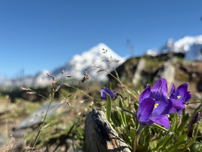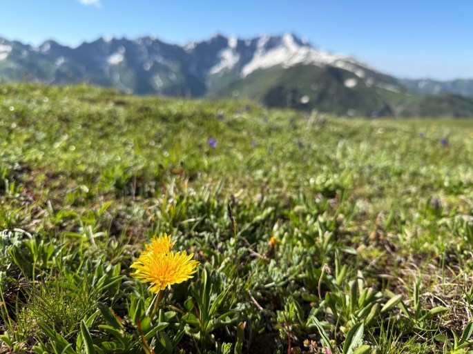 Desde el primer momento en esta ruta ascendemos. Lo vamos a hacer en la mayoría del recorrido con un desnivel en ocasiones superior al 40% y no menos del 20 %, que nos obliga a levantar las rodillas a cada paso que damos y que termina marcando nuestro ritmo al compas de la respiración entrecortada. Es como subir una larga escalera de casi 900 metros de altura. No nos preocupa la distancia, apenas 9 km., sólo la altura y que debemos realizarla sin la sombra de los árboles, pues en toda la ladera no vamos a encontrar ningún bosque, solamente una extensa pradera, que en estas fechas tras el deshielo tiene un verde intenso y esta repleta de diversas flores que salpican esa alfombra verde de bonitos colores.