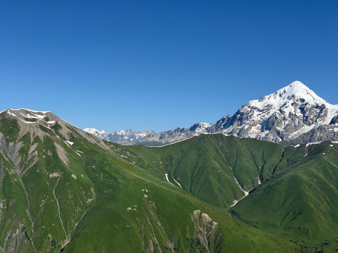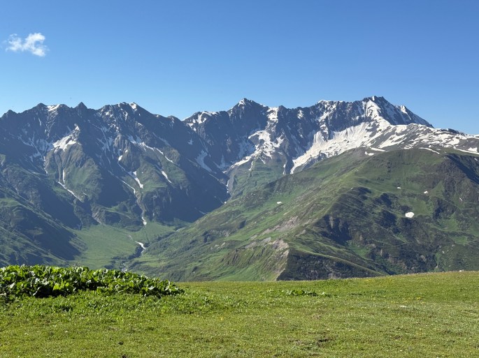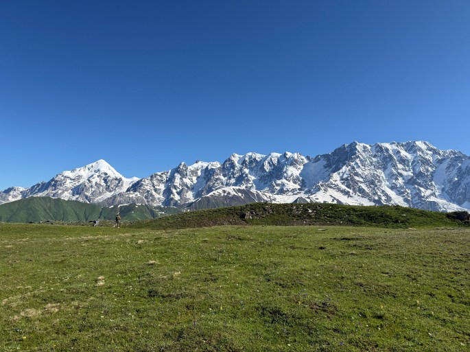 Nos vamos estirando los 12 miembros del grupo, capitaneados por Davit, el guia, mientras ascendemos. Iñaqui ha optado por realizar en solitario la aproximación a la morrena del glaciar por el fondo del valle. Al llegar a la cima volvemos a agruparnos para celebrar la cumbre. Permanecemos un buen rato de la mañana admirando toda la panorámica que nos ofrece esta loma extensa a casi 3000 metros de altura. El día es perfecto. No hace frío y el ligero viento nos refresca de la intensa insolación. El cielo, completamente despejado, deja libre de nubes todas las cimas que superan los 5000 metros de la cadena Shkhara, la tenemos enfrente y ante ella nos sentimos pequeños e insignificantes. Se muestra imponente el monte Tetnuldi (5.193 m.), la cima más alta de Georgia, y a lo lejos, ya en territorio ruso, completamente blanco se eleva el monte Elbrus (5.642 m.), la montaña más alta de Europa.