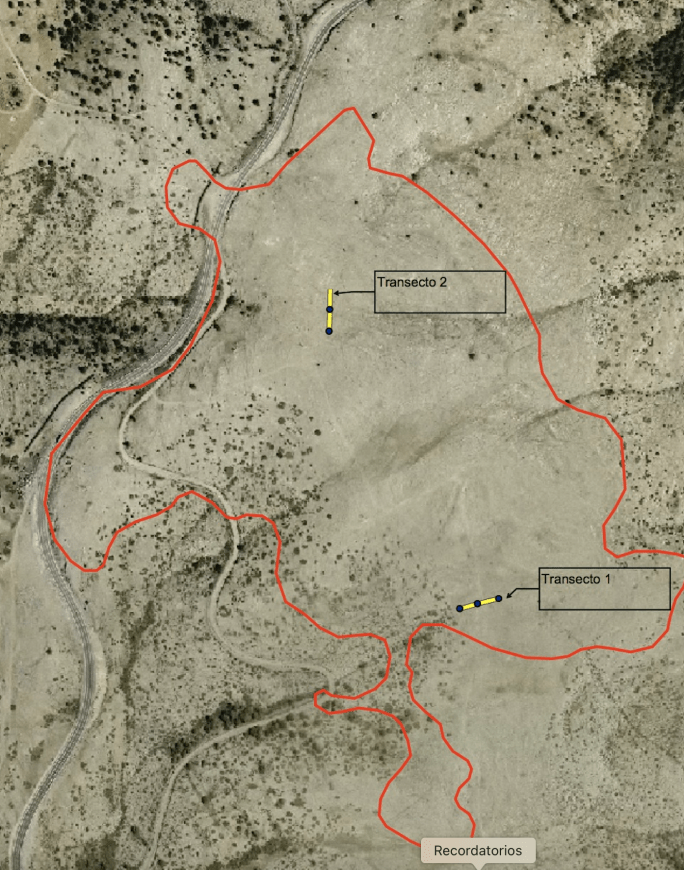 El segundo año se sumo un segundo trayecto a la población de las Casillas de Cedrillas (transecto 4) y otro más alejado en la población más alejada de Cerrito Redondo (transecto 5).