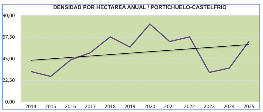 Hemos analizado estadísticamente los datos obtenidos a lo largo de estos años, debiendo indicar que de Escriche sólo disponemos de datos de tres años. Teniendo en cuenta la superficie de los transeptos (longitud y 5 metros de anchura), así como el número de los días de seguimiento realizados a lo largo de la temporada hemos obtenido los datos totales de mariposas por hectárea. El año pasado se observó un descenso significativo, las condiciones ambientales de esta primavera, con abundante lluvia, ha favorecido el desarrollo de la vegetación y la densidad ha mostrado una recuperación significativa.