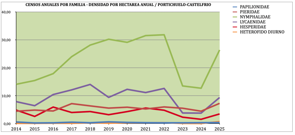 Para corregir los posibles errores de identificación por especie y genero, hemos agrupado y totalizado los datos obtenidos por familias. El año pasado se observo un descenso considerable de la familia de los Lycaenidae y Hesperidae, seguramente motivado porque los prados apenas tuvieron un desarrollo vegetativo y se agostaron rápidamente al inicio del verano. Este año el desarrollo de la vegetación ha permitido la recuperación de estas poblaciones. No obstante especies primaverales como las Anthocharis euphenoides y cardamines no han volado en la cantidad que se observaron en Castelfrio durante los primeros años de censos (2016-2020).