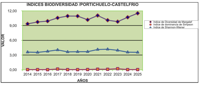 Y en relación al indice de Shannon-Wiener, que expresa la uniformidad de los valores de importancia a través de todas las especies de la muestra, que es una medida del grado promedio de incertidumbre en predecir a que especie pertenecerá un individuo escogido al azar de una colección, también consideramos una evolución homogénea a lo largo de los años. Se mide generalmente a través del número de especies presentes y su distribución (abundancia relativa).
