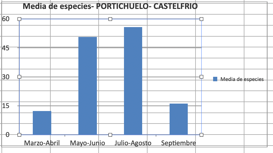 Por último totalizando el número de especies observadas en diferentes meses, vemos que el pico de mayor diversidad se da entre Mayo y Agosto.
