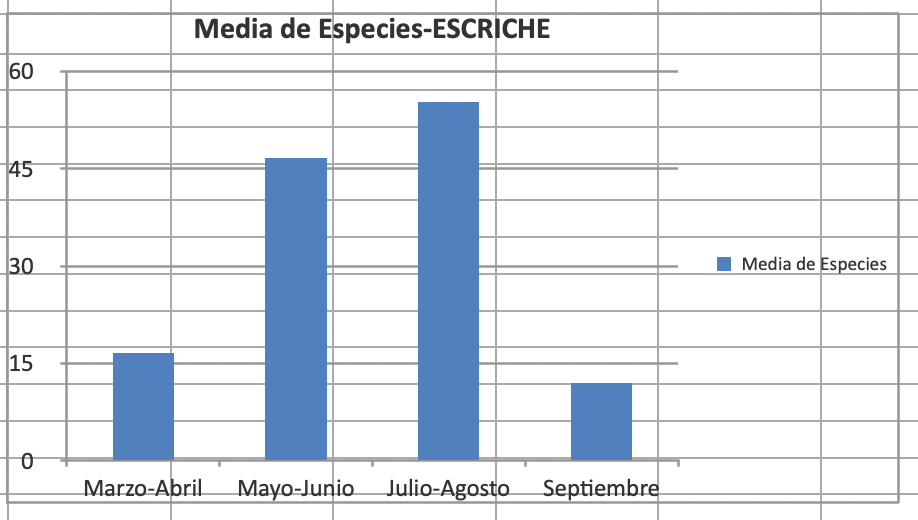 En Escriche se han identificado 88 especies. La climatología favorable de este año junto a las características físicas de este enclave propicia un menor agostamiento del pastizal, lo que permite mantener condiciones más favorables en comparación con los datos que hemos obtenido en Castelfrio. En él hemos continuado aumentando el número de citas de nuevas especies a lo largo de los tres años en que llevamos realizando el transepto: