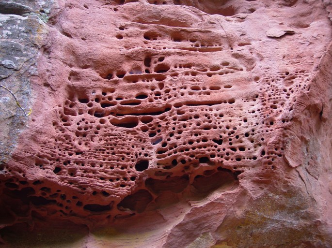 Las rocas esta modeladas por estructuras erosivas como gnammas (pequeñas cavidades en superficies horizontales) y taffonis (huecos en paredes verticales), ademas de macroformas como los susodichos callejones, pasillos, o aquellas con formas de setas y torreones, resultado de la erosión del viento y la lluvia. Modelados que se combinan con anillos de Liesegang, bandas concéntricas causadas por la precipitación de minerales. A su vez proporcionan resguardo naturales para protegerse de la lluvia y el viento, abrigos y cavidades donde en ocasiones se encuentran grabados y pinturas del arte rupestre levantino.