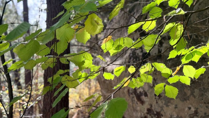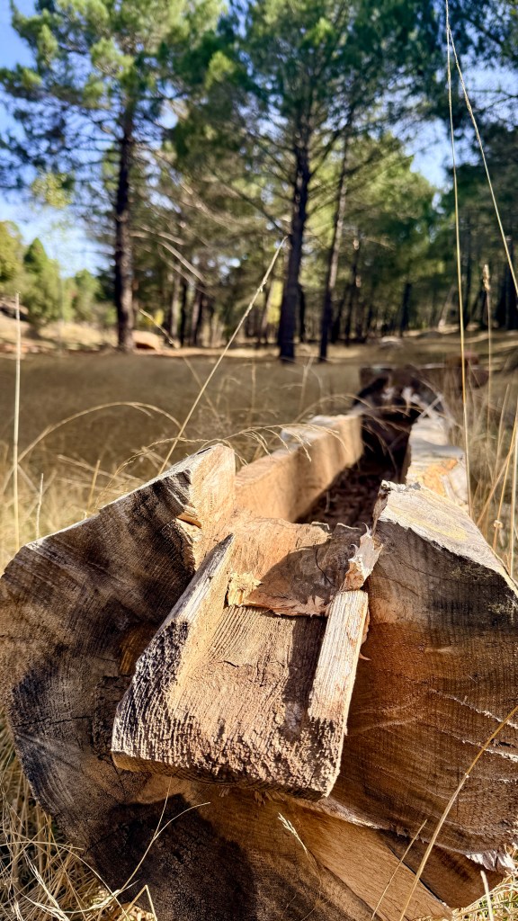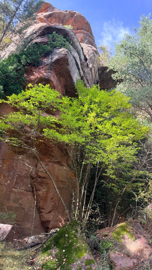 Conforme avanzo las areniscas van siendo suplantadas por calizas, se trata de la facies Müschelkalk (la traducción del alemán es ‘caliza con conchas’), periodo el que debe nuevo el mar ocupó el continente originando sedimentación marina. Y en ese sustrato el Pinus pinaster va siendo sustituido por el Pinus nigra.