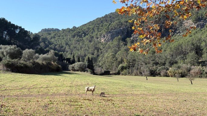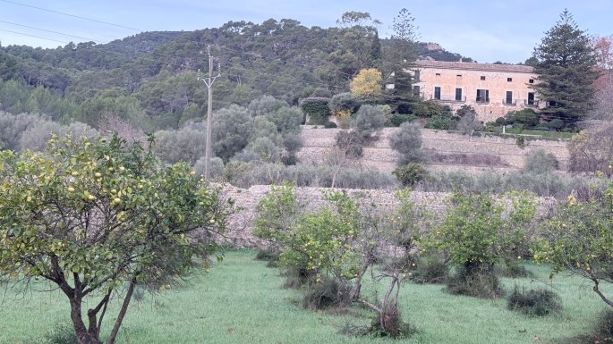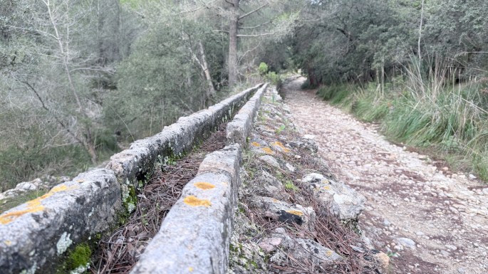 Hemos iniciado nuestra ruta en Puigpunyent, siguiendo el camino viejo que comunicaba este pueblo con el de Estellencs. Atravesamos Son Fortaleza, una vieja posesión donde todavía disfrutamos de los bancales poblados de limoneros. Aquí iniciamos nuestra ascensión por una vieja senda flanqueada por bancales abandonados donde el pinar y el encinar colonizan el terreno perdido, junto a madroños y lentiscos. En ocasiones el camino lo limita un muro sobre el que se extiende una pequeña regata horadada en las piedras desde la que se distribuía el agua en los campos de cultivo.