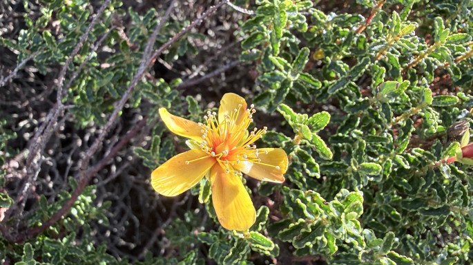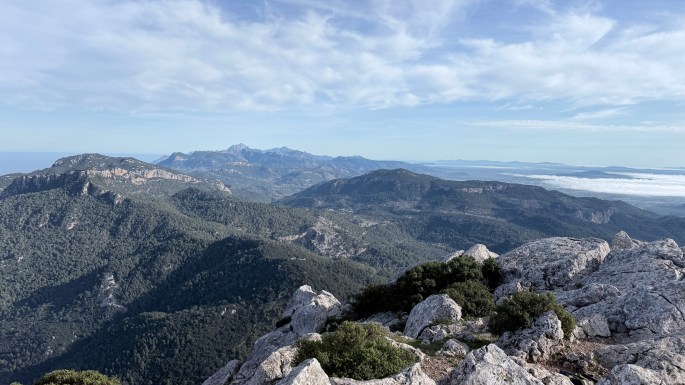 Nos adentramos en un profundo bosque Mediterráneo hasta llegar al Coll des Carniceret, bajo El Puig de Galatzó. No ascendemos por esta abrupta y exigente pared de roca caliza, seguimos la senda que tras atravesar una gran torrentera de piedras, donde nos vemos obligados a utilizar las manos para mantener el equilibrio al cruzar el río de rocas arrastradas, nos acerca hasta el Pas de na Sabatera, desde volvemos a tomar una senda señalizada por la que iremos ascendiendo hasta el punto geodésico de esta montaña. El encinar nos abandona y tras él el pinar de Pinus halepensis conforme nos vamos adentrando por un espacio de grandes rocas que hemos de ir sorteando hasta alcanzar un paso que nos lleva hasta el último repecho antes de alcanzar la cima. La vegetación que entre las piedras se extiende son brotes arbustivos de un endemismo de la isla, el Hypericum balearicum L., todavía en floración, junto enormes macollos de la gramínea Ampelodesmos mauritanicus, pinchudos arbustos de Juniperus oxycedrus o aromáticos de Rosmarinus officinalis L. En torno a ellas pastan algunas cabras asilvestradas, muy frecuentes en la isla.