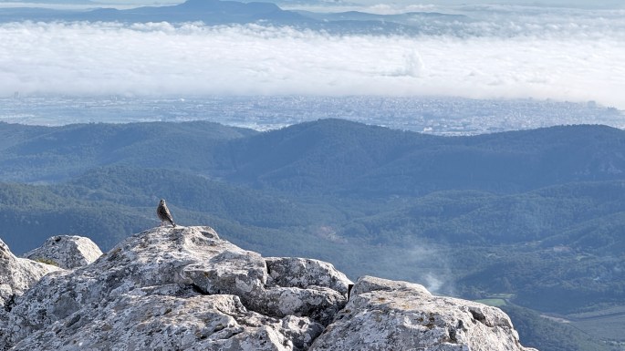Desde aquí la plana de la isla esta cubierta por un mar de nubes de la intensa niebla que chorrea en la ciudad. Pero en los altos un intenso sol nos permite contemplar la ampliar vista del horizonte. Una mariposa limonera (Gonepterys rhamni), una especie que como la Vanesa atalanta, que volaba en el bosque, hibernan refugiadas entre las grietas de árboles y muros de piedra y aprovechan estos días soleados para disfrutar del vuelo durante algunos días del invierno.