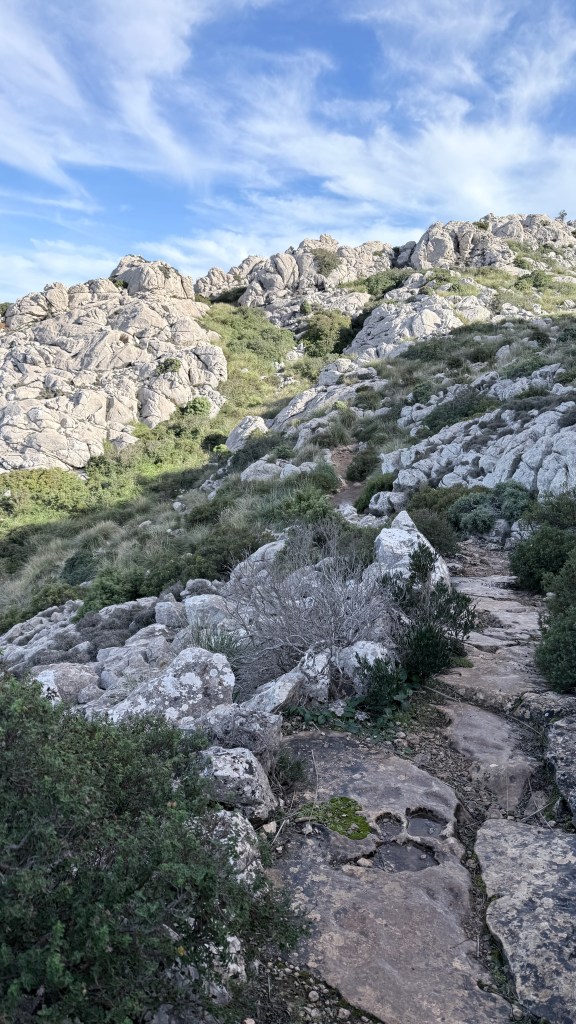Llegamos al Coll d’Estallencs. Un muro de piedra se abre en un portal que nos da paso a la ladera que cae hacía la costa del Mediterráneo. A los pocos metros de iniciar la bajada, tomamos una senda a nuestra izquierda abandonando el viejo camino que hemos seguido hasta entonces.