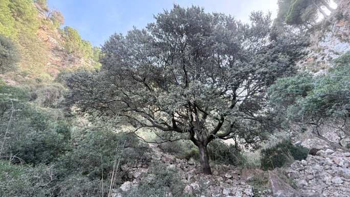 De nuevo en el Pas de na Sabatera tomamos la dirección hacia el Bol de ser Serveres en un intensa bajada donde en el último tramo en el fondo del barranco encontramos vetustos ejemplares de alcínas (Quercus ilex). Al llegar al merendero continuamos lo que sería una ruta circular que nos conectaría con el Pan de na Sabatera de nuevo, la otra opción para descender desde este lugar. Queremos conocer también el paisaje de esta ruta donde se localizan muchos elementos etnologícos en torno al aprovechamiento para obtener carbón vegetal al que durante años estuvieron sometidos estos bosques. Retomamos el regreso cuando la senda comienza a empinarse profundamente.